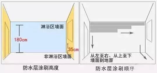 ▲因?yàn)榱茉∫话阊b到180cm的位置,所以防水要做到180cm,而沒(méi)有淋浴的墻面防水高度為30cm,有淋浴的墻面防水高度為180cm且不低于淋浴噴頭。另外,有淋浴、浴缸和桑拿的墻面防水高度應(yīng)做到頂。如果選用聚氨酯做防水涂料,反復(fù)涂刷2~3遍就可以了。聚氨酯涂料本身可以形成彈性保護(hù)膜,具有一定耐拉性能。為了提高防水效果,可以鋪貼一層玻璃絲布。